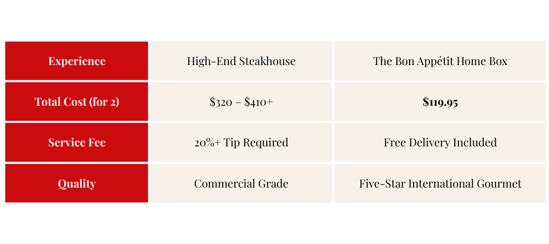 Skip the crowded restaurants, the overpriced wine, and the weeks-long waiting lists. Enjoy a world-class, multi-course dinner featuring our legendary Filet Mignon and Wild-Caught Lobster, delivered straight to your door.